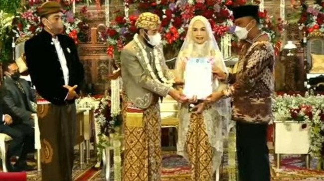 Usai akad nikah, kedua mempelai menerima buku nikah yang diserahkan oleh Kepala KUA Banjarsari, Kota Solo, Arbain Basyar. Kedua mempelai pun nampak berdiri menunjukkan buku nikah mereka.