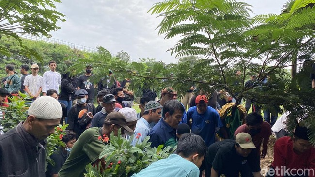 Terlihat ada empat petugas yang mengurus pemakaman. Tetangga hingga keluarga hadir di lokasi. Isak tangis pun pecah saat jenazah dikebumikan.