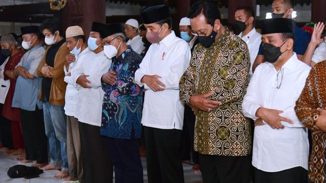 Jokowi langsung menunaikan ibadah salat Asar berjemaah sebelum melakukan salat jenazah. Tampak hadir Menteri Sekretaris Negara Pratikno dan Gubernur DIY Sri Sultan Hamengku Buwono X.