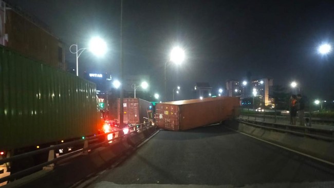 Truk kontainer terguling di jalan layang Grogol arah Tomang, Jakarta Barat (Jakbar). Kendaraan tidak bisa melintasi lokasi tersebut karena kontainer menutupi jalan.