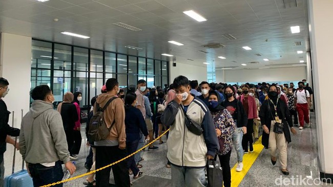 Pantauan detikcom di Stasiun Manggarai, Minggu (29/5/2022), sekitar pukul 13.50 WIB, antrean penumpang terlihat di gedung utama atau main hall stasiun. Para penumpang itu tengah transit di Stasiun Manggarai untuk menaiki kereta selanjutnya.