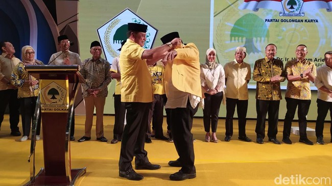 "Dengan jas ini saya pasangkan, itu adalah simbol (IAS) resmi gabung Partai Golkar," kata Wakil Ketua Umum DPP Golkar Nurdin Halid