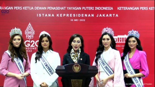 Keterangan mengenai pertemuan itu disampaikan Ketua Dewan Penasihat Yayasan Puteri Indonesia, Putri Kuswisnuwardhani, dalam jumpa pers yang disiarkan di akun YouTube Sekretariat Presiden, Senin (30/5/2022). Hadir juga runner-up 1 Puteri Indonesia 2022, Cindy May McGuire, dan runner-up 2 Puteri Indonesia 2022, Adinda Cresheilla. Sementara itu, Jokowi didampingi oleh Menparekraf Sandiaga Uno.