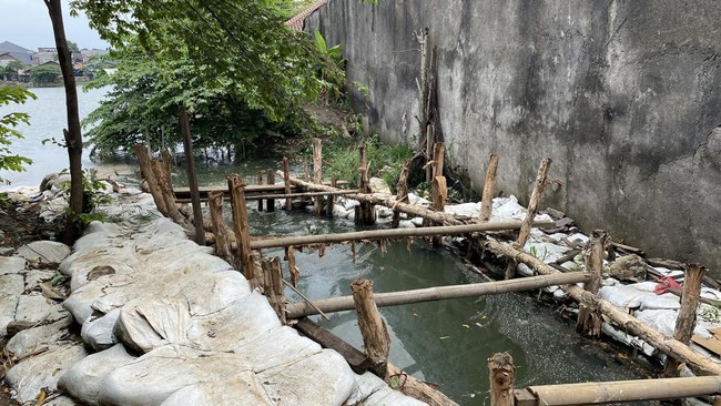 Pantauan detikcom di lokasi, Sabtu (30/5/2022), kondisi masih seperti pada 18 Mei 2022. Kayu-kayu masih terpasang menahan tumpukan karung. Fungsinya agar tanah saluran air tidak longsor.