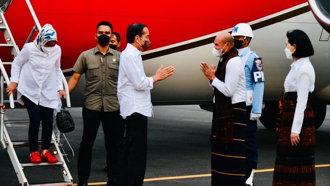 Jokowi tiba di Bandar Udara Haji Hasan Aroeboesman, Kabupaten Ende, NTT, Selasa (31/5/2022) sekitar pukul 17.25 Wita. Jokowi dan Iriana lalu disambut Gubernur NTT Viktor Laiskodat beserta istri, Pangdam IX/Udayana Mayjen TNI Sonny Aprianto, Kapolda NTT Irjen Setyo Budiyanto, dan Danlanud El Tari Marsma TNI Aldrin Petrus Morgan.