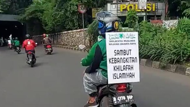 Dalam video yang dilihat detikcom, poster bertuliskan kata-kata 'khilafah' sengaja dipasang di bagian belakang motor. Pengendara sepeda motor mengenakan baju berwarna hijau.