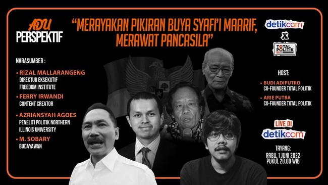 Adu Perspektif, kolaborasi Detikcom dan Total Politik malam ini mengangkat tema "Merayakan Pikiran Buya Syafi'i Maarif, Merawat Pancasila". Bersama Direktur Eksekutif Freedom Institute Rizal Mallarangeng, Konten Kreator Ferry Irwandi, Peneliti Politik Northern Illinois University Azriansyah Agoes dan Budayawan M. Sobary, saksikan secara langsung diskusinya di kanal 20detik detikcom Rabu, 1 Juni 2022 pukul 20.00 WIB.