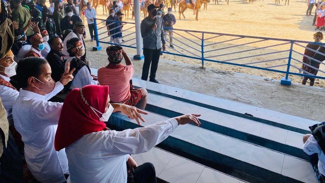 Tampak ratusan kuda siap berlomba. Saat menonton lomba, Jokowi dan Iriana didampingi Bupati Sumba Timur Khristofel Praing. Tak berapa lama, Iriana mengajak anak-anak Sekolah Dasar (SD) untuk duduk di dekatnya.