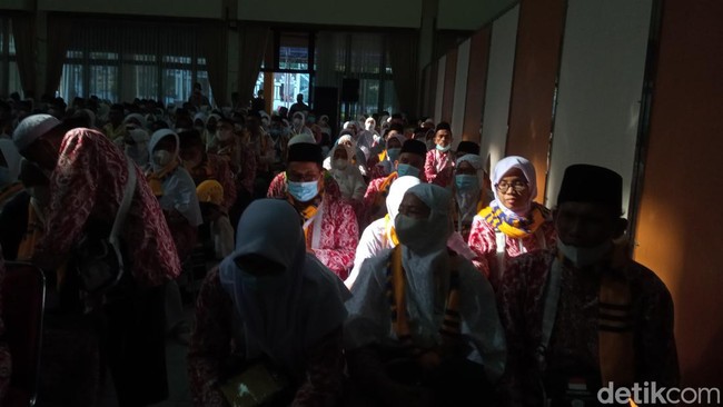 Pantauan detikcom, Jumat (3/6/2022), jemaah haji mulai berdatangan menggunakan bus. Mereka diarahkan panitia haji menuju aula untuk diberi arahan dan kata sambutan.