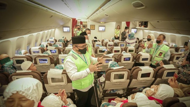 Menteri Agama (Menag) Yaqut Cholil Qoumas mewakili Menko PMK Muhadjir Effendy melepas kloter pertama embarkasi Jakarta-Pondok Gede di Bandara Soekarno-Hatta pagi ini. Menag berpesan agar jemaah haji meluruskan kembali niatnya ke Tanah Suci.