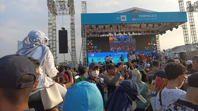 Pantauan detikcom di lokasi pada Sabtu (4/6/2022) sore, penonton Formula E sudah berkumpul di depan sebelum tiga besar juara Formula E naik ke atas podium. Tingginya antusiasme penonton melihat sang juara menyebabkan terjadinya kerumunan.