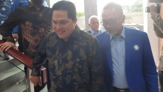 Pantauan detikcom di kantor DPP PAN, Jakarta Selatan, Minggu (5/6/2022), terlihat Erick Thohir mengenakan baju batik. Erick tiba pada pukul 12.39 WIB dan berjalan ke lantai 2 ditemani Ketua Majelis Penasihat Partai (MPP) DPP PAN Hatta Rajasa.