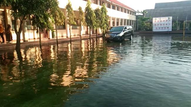 Dari video yang diberikan Afan, tampak banjir masih menggenangi area sekolah. Sejumlah orang bekerja untuk mengurangi ketinggian banjir.
