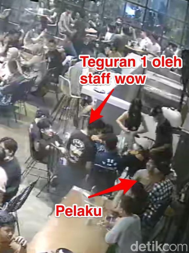 Pemilik Kafe Wow, Andri Laksono, memberikan dua gambar berupa tangkapan layar CCTV. Dari gambar yang diterima detikcom, Rabu (8/6/2022), tampak ada dua momen staf Kafe Wow mendatangi meja pria yang pangku-pangkuan. Pada gambar tangkapan layar CCTV itu ditulis 'Teguran 1 oleh Staf Wow'.