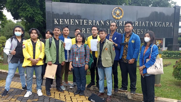 Pantauan detikcom, perwakilan Aliansi Nasional Reformasi RKUHP mendatangi kantor Kementerian Sekretariat Negara (Setneg), Jalan Veteran, Jakarta Pusat, Kamis (9/6/2022), pukul 14.25 WIB. Ada 10 mahasiswa yang mendatangi kantor Setneg.