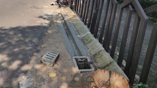 Pekerja membawa ember berisi semen kemudian merapikan tali air itu sesuai ukuran pipa. Kerucut oranye juga terpasang di pinggir jalan untuk memberi jarak bagi para pengendara.