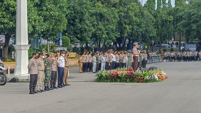 Ratusan anggota gabungan sudah berbaris. Selain anggota kepolisan, terlihat anggota TNI, Dishub, Satpol PP, dan Jasa Marga di sana.