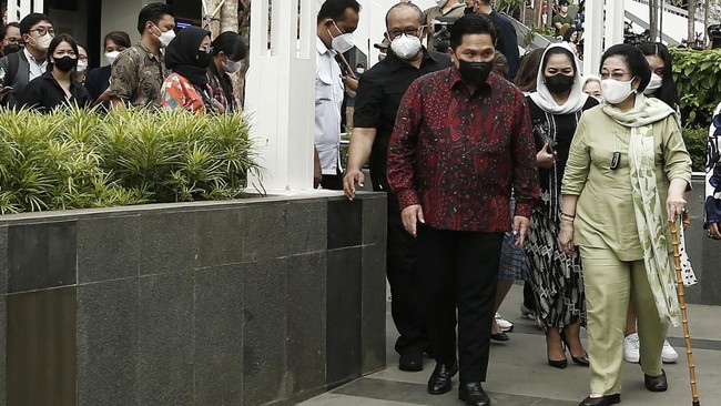 Ketua Umum PDIP Megawati Soekarnoputri ditemani Menteri BUMN Erick Thohir berkeliling Gedung Sarinah, Jakarta Pusat. Dalam kunjungannya, Megawati mengatakan ada relief yang menggambarkan kehidupan kaum tani yang sempat disembunyikan setelah ayahnya lengser sebagai presiden RI.