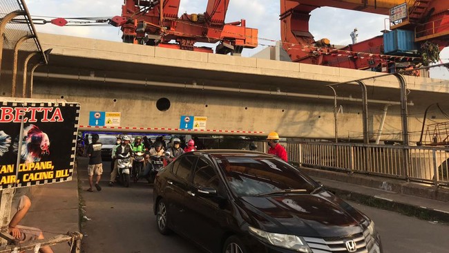 Rata-rata pengendara motor menundukkan kepalanya saat melintas di bawah box girder yang melintang di atas Jembatan Antilope. Portal dengan rambu batas ketinggian maksimum 1,7 meter terpasang di lokasi.