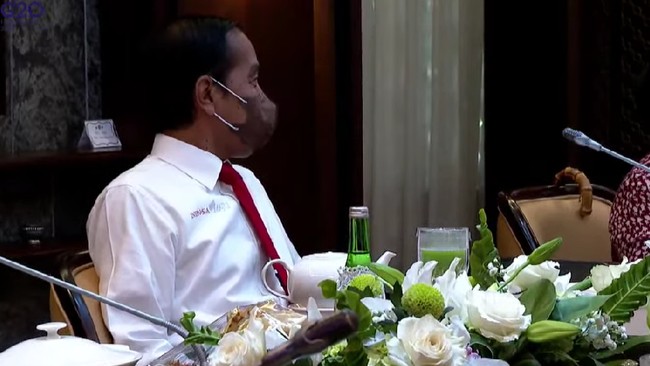 Dilihat detikcom dari YouTube Sekretariat Presiden, Rabu (15/6/2022), kemeja putih bertuliskan 'Indonesia Maju' itu dikenakan Jokowi saat makan siang bersama para ketua umum partai koalisinya. Tulisan 'Indonesia Maju' terlihat saat Jokowi membuka jas yang dikenakannya.