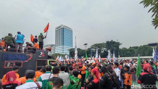 Massa buruh yang tergabung dalam Partai Buruh dan serikat buruh menggelar unjuk rasa di depan gedung DPR RI hari ini. Mereka membawa beberapa tuntutan, mulai menolak revisi Undang-Undang Pembentukan Peraturan Perundang-Undangan (UU PPP) hingga menyoroti pelaksanaan kampanye 75 hari.