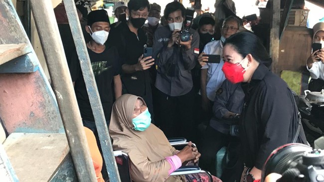Puan langsung menuju salah satu rumah. Warga yang dikunjungi Puan itu merupakan seorang nenek yang duduk di kursi roda.