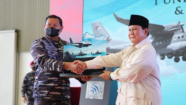 Menteri Pertahanan atau Menhan Prabowo Subianto menyerahkan alutsista produksi PT Dirgantara Indonesia (PTDI) kepada Kepala Staf TNI AL (KSAL) Laksamana TNI Yudo Margono. Pesan khusus disampaikan Prabowo kepada BUMN industri pertahanan itu.