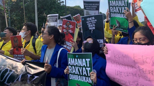 Pantauan detikcom di lokasi, Selasa (21/6/2022), sekitar pukul 14.27 WIB, massa mahasiswa tampak membawa atribut seperti bendera dan identitas kampus. Jalan Medan Merdeka Barat dari arah Istana dan sebaliknya belum dilakukan penutupan. Menggunakan jas almamater, mereka datang sambil menyanyikan lagu ulang tahun (ultah) untuk Presiden Joko Widodo (Jokowi).