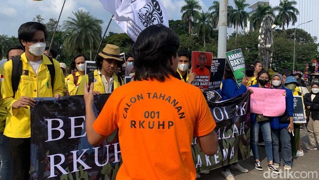 Mahasiswa yang tergabung dari sejumlah kampus melakukan aksi unjuk rasa menolak draf Rancangan Kitab Undang-Undang Hukum Pidana (RKUHP) di Patung Kuda, Jakarta Pusat. Pendemo tampak memakai kaus oranye bertuliskan 'Calon Tahanan RKUHP'.
