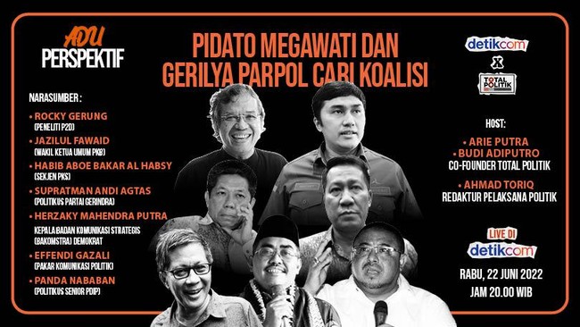 Adu Perspektif malam ini kolaborasi detikcom bersama Total Politik mengangkat topik 'Pidato Megawati dan Gerilya Parpol Cari Koalisi'. bersama Rocky Gerung peneliti P2D, Jazilul Fawaid Wakil Ketua Umum PKB, Habib Aboe Bakar Al Habsy Sekjen PKS, Supratman Andi Agtas politikus Partai Gerindra, Herzaky Mahendra Putra Jubir Partai Demokrat, Effendi Ghazali pakar komunikasi politik, dan Panda Nababan politikus senior PDIP, saksikan secara langsung di detikcom, Rabu, 22 Juni 2022 pukul 20.00 WIB.
