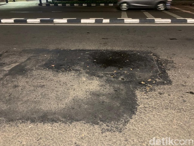 Kemudian, aspal di bawahnya pun terlihat basah karena tetesan tersebut. Aspal jalan itu tampak berwarna lebih gelap karena tambalan ulang.