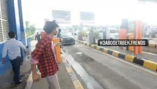 Dalam video tersebut, tampak seorang pria berdiri menghalangi palang gerbang Tol Jatikarya. Tampak pula seorang pria lainnya tengah sibuk mengarahkan kendaraan agar segera melintas.