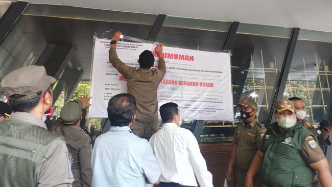 Pantauan detikcom di lokasi, pukul 09.38 WIB, Kamis (30/6/2022), tampak petugas Satpol PP DKI Jakarta memasang spanduk penyegelan.
