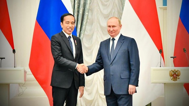 Presiden RI Joko Widodo (Jokowi) bertemu dengan Presiden Rusia Vladimir Putin di Istana Kremlin, Moskow. Jokowi meminta Rusia untuk menjamin jalur ekspor pangan Ukraina.