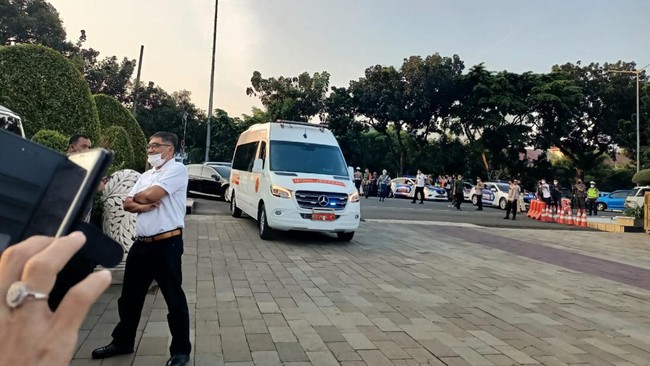 Pantauan detikcom di lokasi sekitar pukul 17.07 WIB, Jumat (1/7/2022), tampak ambulans yang membawa peti jenazah Tjahjo Kumolo tiba di lokasi.