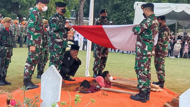 Tampak peti jenazah Tjahjo Kumolo diselimuti bendera Merah-Putih. Pasukan TNI AD mengiringi jenazah Tjahjo Kumolo ke tempat peristirahatan terakhirnya. Terlihat pasukan berbaris dan mengiringi jenazah dengan drum band.