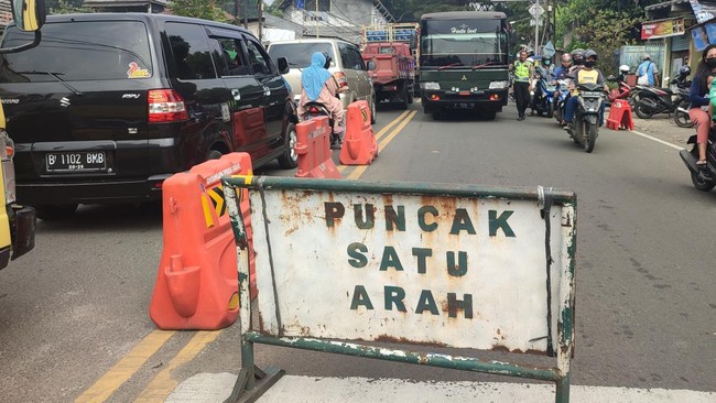 Pantauan detikcom di Simpang Gadog, one way arah Jakarta disiapkan sejak pukul 12.30 WIB. Petugas kepolisian memasang barier penutup jalan menuju Puncak.