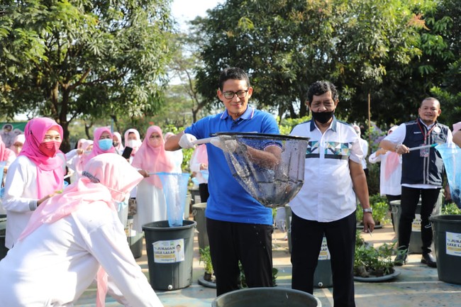 Menteri Pariwisata dan Ekonomi Kreatif (Menparekraf) Sandiaga Uno memanen ratusan kilo ikan lele bersama warga di Kelurahan Pesanggrahan, Jakarta Selatan. Panen kali ini merupakan kegiatan lanjutan dari program Juragan Lele Lalap yang dijalankan Rumah Sandi Uno Indonesia (RSI) bersama Rumah Siap Kerja (RSK).