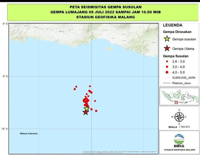 "BMKG: Hasil monitoring hingga saat pukul 11.00 WIB telah terjadi 34 kali aktivitas gempa susulan di selatan Jawa Timur," kata Daryono, Sabtu (9/7/2022). Daryono telah mengizinkan detikcom mengutip cuitannya.