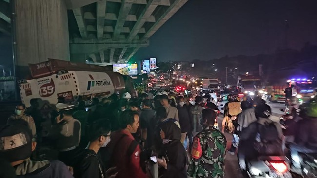 "TKP di sini, jadi kendaraan Pertamina berjalan dari arah Cibubur menuju Cileungsi, di mana memang kondisi jalan menurun dan lampu merah ada kendaraan yang sedang berhenti," ujar Latif di lokasi.