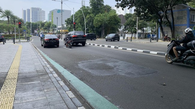 Situasi lalu lintas di persimpangan lampu merah dekat Metrople Jakpus siang hari ini terpantau ramai lancar. Para pemotor terlihat tidak lagi menghindari titik di bawah jembatan yang bocor tersebut saat lampu merah.