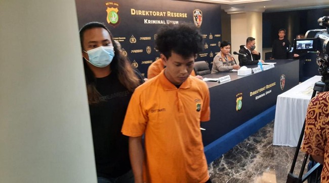 Tersangka M dkk dihadirkan dalam jumpa pers di gedung Ditreskrimum Polda Metro Jaya, Jumat (22/7/2022). Tersangka M mengenakan baju tahanan dengan tangan terikat kabel tis.