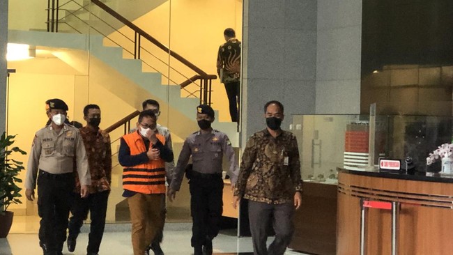 Pantauan detikcom di gedung KPK, Jalan Kuningan Persada, Jakarta Selatan, pukul 17.28 WIB, Jumat (22/7/2022), Dandan terlihat turun dari ruang pemeriksaan penyidik.