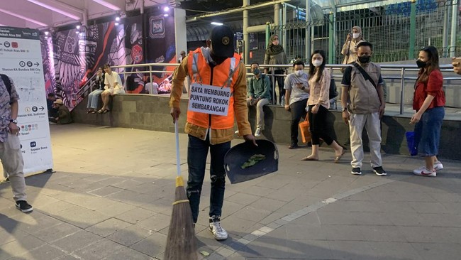 Pengunjung itu tampak menggunakan rompi oranye serta kertas yang dikalungkan di lehernya. Kertas itu bertulisan 'Saya Membuang Puntung Rokok Sembarangan'.