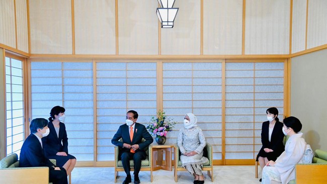 Presiden Joko Widodo (Jokowi) dan Iriana Joko Widodo melakukan kunjungan kehormatan kepada Kaisar Jepang Naruhito dan Permaisuri Masako di Istana Kekaisaran Jepang, Tokyo. Kaisar Jepang senang bisa bertemu kembali dengan Presiden Jokowi.