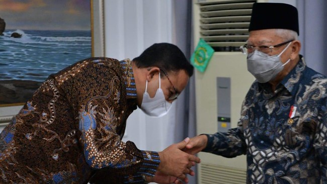 Anies Baswedan menyambangi Wakil Presiden Ma'ruf Amin pada Selasa (26/7) kemarin. Kedatangan Anies untuk menyampaikan undangan pernikahan putrinya Mutiara Baswedan.