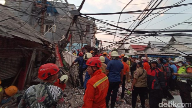 Petugas gabungan dari Suku Dinas Penanggulangan Kebakaran dan Penyelamatan Jakarta Pusat, Basarnas, BPBD DKI Jakarta masih melakukan evakuasi di sana. Beberapa warga sekitar pun tampak memenuhi area robohnya bangunan.