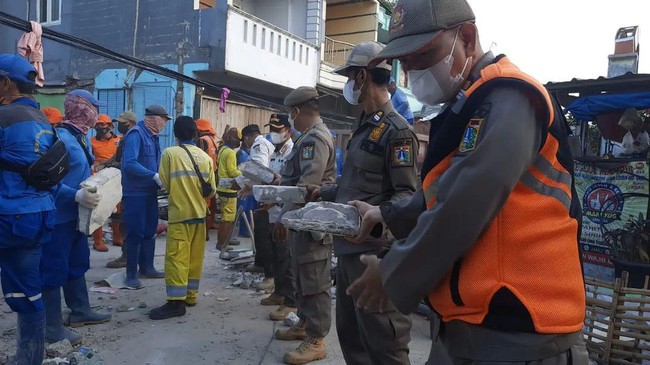 Dari foto yang dilihat detikcom di akun Instagram Satpol PP DKI Jakarta, @satpol.dki, tampak petugas gabungan berbaris rapi mengangkat puing bangunan tersebut. Terlihat ada satu truk bertulisan Suku Dinas Sumber Daya Air ada di lokasi.