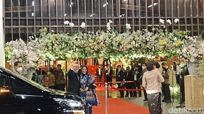 Tak lama setelah itu, Zulkifli Hasan juga tiba di lokasi acara resepsi pernikahan. Dia datang bersama istrinya, Soraya.