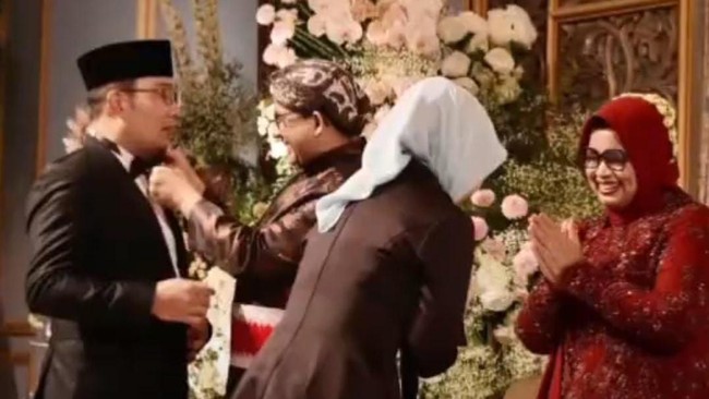 Gubernur Jawa Barat Ridwan Kamil (RK) menghadiri pesta pernikahan putri sulung Anies Baswedan, Mutiara Annisa Baswedan, dengan Ali Saleh Alhuraiby di Putri Duyung Cottage, Jakarta Utara (Jakut). Ridwan Kamil datang bersama istrinya, Atalia Praratya.